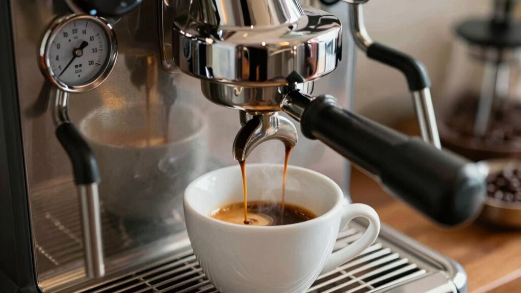 Although brewing espresso can seem straightforward, it’s easy to make common mistakes that can ruin your shot. First, pay attention to grind size; too coarse or too fine can lead to under-extraction or over-extraction. Next, monitor pressure variation during brewing, as inconsistent pressure affects flavor. Don’t overlook water quality; using filtered water enhances the taste. Keep an eye on extraction time; aim for 25-30 seconds for ideal results. Regular machine maintenance is essential—clean your equipment to prevent buildup that can impact flavor. Finally, always use fresh coffee; stale beans can diminish your espresso’s richness. By avoiding these pitfalls, you’ll take a big step toward brewing the perfect shot every time.