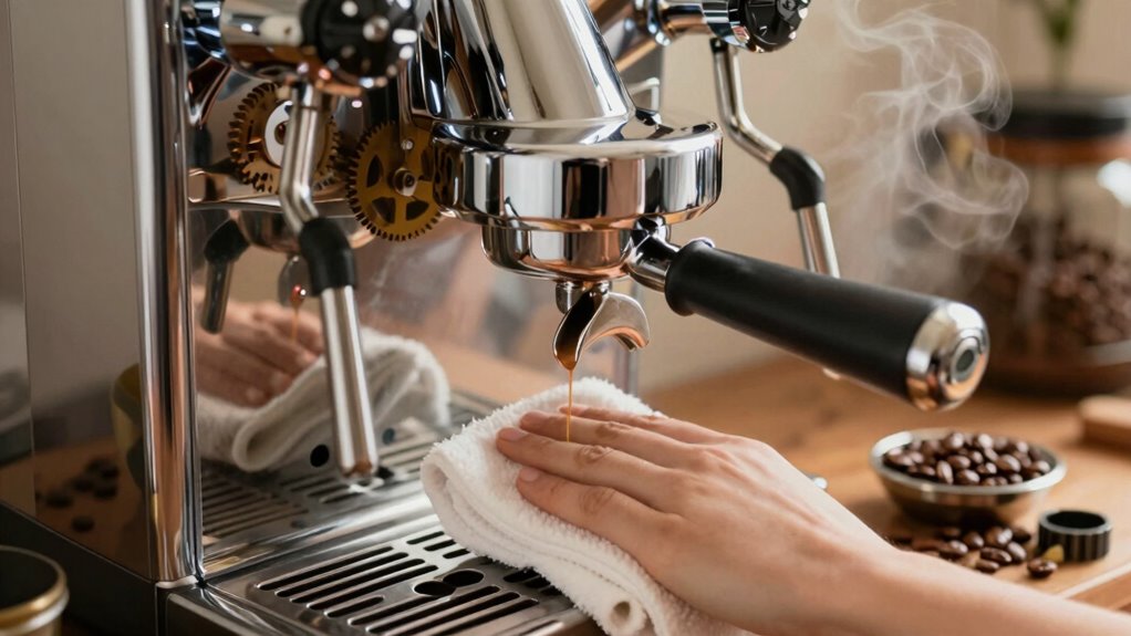 Although daily cleaning tasks might seem tedious, they’re essential for maintaining your espresso machine’s performance and longevity. Incorporating these tasks into your daily routines guarantees ideal brewing conditions and extends the machine’s life. Start with a quick wipe-down using the right cleaning supplies to maintain hygiene practices. Implement effective cleaning techniques, like backflushing, to keep components free from coffee oils. Proper skin care can also enhance your overall routine, ensuring you’re putting your best face forward while enjoying that perfect cup. Using essential oils for oral health, like tea tree oil, can also help you maintain a clean environment, ensuring you prevent any potential oral issues while you enjoy your coffee. To further optimize your cleaning process, consider using dryer balls in your laundry routine to enhance the cleanliness of your espresso machine’s accessories. Use efficiency tips to streamline your process, so it doesn’t eat into your time management. Setting up a maintenance schedule can help you stay organized and keep costs down. With these cost-effective solutions, you’ll not only save money but also enjoy consistently great espresso, making those daily cleaning tasks worthwhile. Additionally, maintaining a clean environment can help reduce microplastics in dust, contributing to better overall air quality in your kitchen. Regular maintenance can also prevent costly repairs and ensure your machine runs smoothly, making robot vacuum maintenance a valuable consideration for overall household upkeep.
