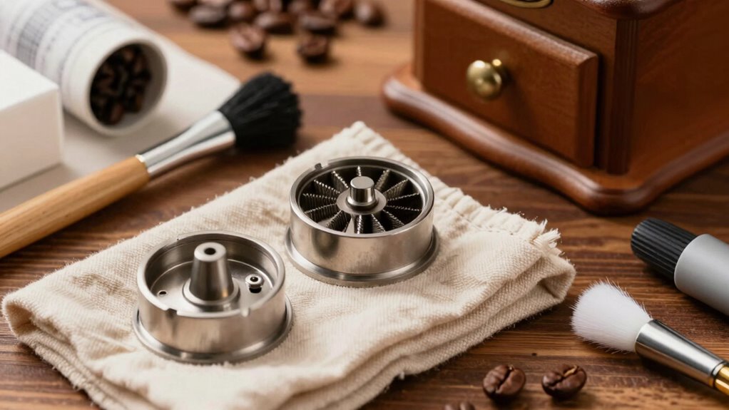 Having these tools ready guarantees you can maintain your grinder effectively, prolonging its lifespan and enhancing your coffee experience. Additionally, keeping your grinder clean is crucial for ensuring optimal light and humidity levels that can affect the flavor of your coffee.