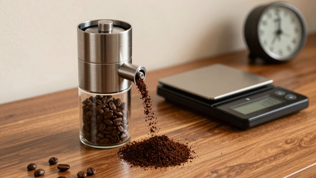 To brew the perfect cup, your grinding workspace needs to be as efficient as your measuring and dosing process. Start with ideal grinder placement—position it where you can easily reach your tools without disrupting your flow. Prioritize workspace organization; keep your coffee beans, scales, and other essentials within arm’s reach. Guarantee tool accessibility by using trays or containers that minimize clutter. Establish a cleaning routine, wiping down surfaces and your grinder after each use to keep everything in top shape. Finally, consider an ergonomic setup; adjust your height and position to prevent strain while grinding. With these adjustments, you’ll enhance your efficiency and enjoy the process even more. Remember, taste and consistency are key elements that can significantly improve your brewing experience.