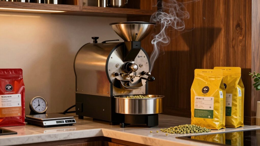 Selecting the right coffee roaster is essential for managing smoke levels in your home roasting setup. Consider both roaster size and heat source when making your choice. Smaller roasters may produce less smoke, while larger ones can handle more beans at once but may require better smoke management. Electric roasters typically generate less smoke than gas models, making them a good option for home use. Additionally, understanding color accuracy can help you choose a roaster that enhances the overall flavor profile of your coffee. Regular kitchen appliance maintenance can also reduce smoke output by ensuring your roaster operates efficiently. Proper maintenance not only helps manage smoke but also improves energy efficiency in your roasting process. Implementing safe power usage practices while operating your roaster can further enhance your roasting experience.