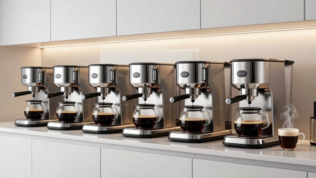 Absolutely, some models are like Swiss Army knives, offering integrated grinders and brewing customization. I’ve seen machines that let you pick grind size, strength, and brew temperature, giving you a personalized coffee experience. These features are perfect if you’re particular about your brew or want to experiment. So, if flexibility and control matter to you, look for coffee makers with built-in grinders and customizable settings—they truly elevate your home brewing game.