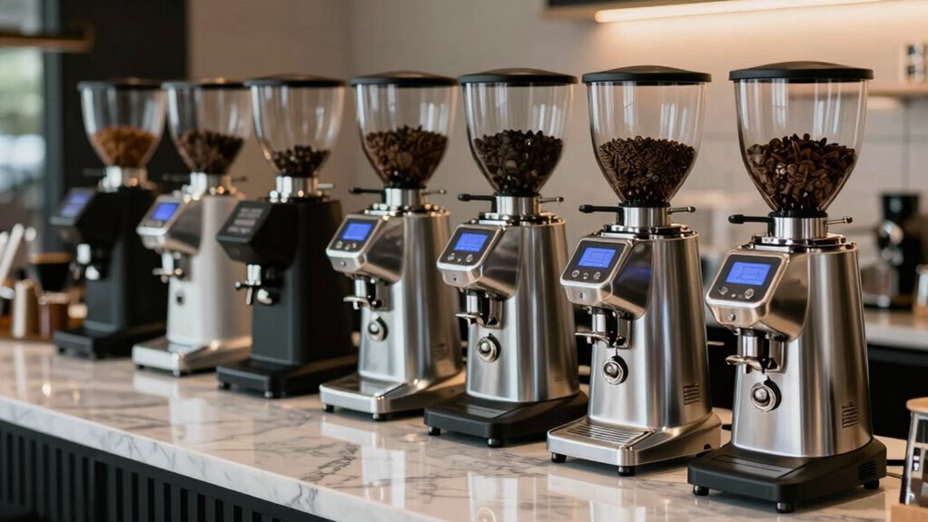 I’ve identified the top six commercial-grade low retention espresso grinders for 2026, including models like the Eureka Atom Specialty 75, Homtone Conical Burr Grinder, and Eureka Libra with weight-based dosing. These grinders excel in delivering consistent, fresh espresso by minimizing static and waste, thanks to their advanced burr designs and easy cleaning features. If you want to discover which one might be the best fit for your setup, there’s plenty more to evaluate below.