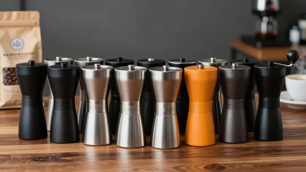 After mastering grind precision, the next thing I consider is build quality and durability. I always look for grinders made from high-quality materials like stainless steel. This guarantees longevity and resistance to wear and tear. A solid build and weight indicate stability during operation, which reduces vibrations that could affect grind consistency. I also prefer models with detachable parts, as they help prevent residue buildup and enhance the grinder’s lifespan. Checking for warranties or guarantees is essential; they often reflect the manufacturer’s confidence in the grinder’s durability. Finally, I assess the overall design and craftsmanship, knowing that well-constructed grinders are less likely to develop mechanical issues over time.
