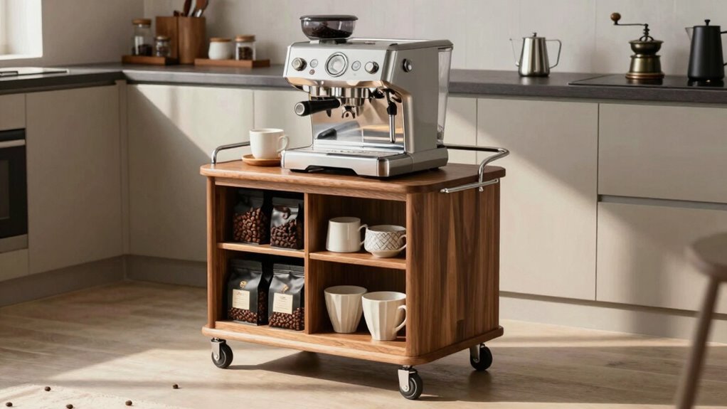 Choosing a coffee station cart that balances mobility and stability is essential for maximizing your espresso experience. I always recommend looking for carts with heavy-duty caster wheels, as they provide excellent mobility and can handle more weight without sacrificing stability. Locking wheels are a must; they keep the cart secure during use, especially when you’re working with heavy appliances like an espresso machine. I also prefer carts with 360° swivel wheels, which make maneuvering in tight spaces much easier. A sturdy frame, crafted from metal or high-quality wood, enhances overall stability when the cart is fully loaded. Don’t forget about adjustable feet—they’re perfect for stabilizing the cart on uneven surfaces, ensuring a secure setup during your coffee-making sessions.