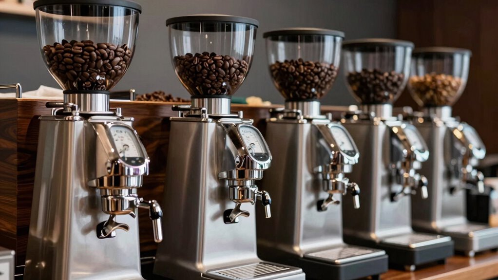 Durability and robust materials lay the groundwork for a premium espresso grinder, but user-friendly features can elevate your brewing experience considerably. I always look for grinders with intuitive interfaces—think touchscreen controls or LED displays—making grind time adjustments straightforward. Precise adjustments are a must; I appreciate the ability to fine-tune grind sizes in small increments for different brewing methods. Programmable features that let me save specific grind times or doses add convenience and consistency. Easy cleaning is also essential, so I prefer models with detachable hoppers and burrs. Finally, I evaluate grinders that include features to minimize mess, like anti-static technology or magnetic dosing cups, which enhance my overall experience and keep my workspace tidy.