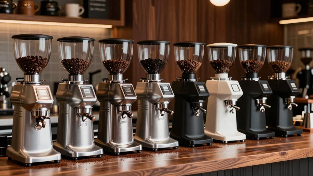 While exploring espresso grinders for light roasts, I find that motor performance plays a vital role in achieving the perfect grind. The power rating, usually measured in watts, directly impacts grinding speed and efficiency; higher wattage motors deliver faster, consistent results necessary for light roasts. I also appreciate brushless motors, which minimize friction and heat, preserving the delicate flavors of my coffee. Torque is another significant factor; higher torque guarantees smoother grinding of harder beans, resulting in a uniform grind size for ideal extraction. Additionally, adjustable grinding speeds can help control granularity, with slower speeds reducing heat. Finally, I prefer quieter motors, especially when I’m grinding in the early morning—nobody wants to wake the whole house!
