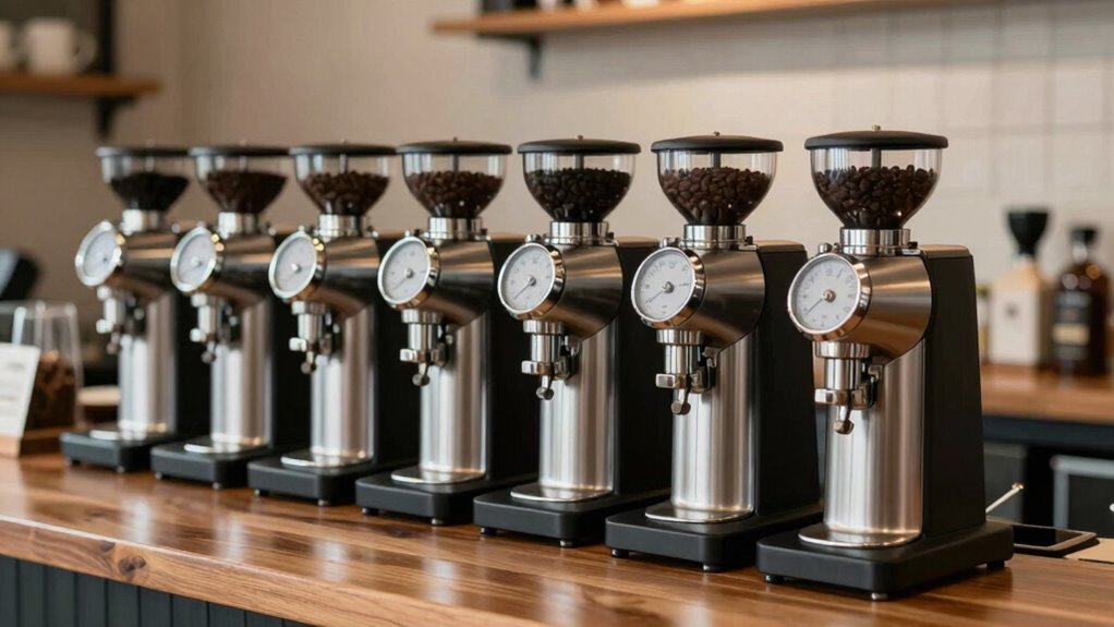 A stepless espresso grinder’s build quality sets the stage, but the user interface can make or break your daily brewing ritual. I find that a user-friendly interface with intuitive controls—like touchscreens or dials—lets me quickly adjust grind size, enhancing my overall experience. Programmable settings with precise timing controls allow me to achieve consistent results, tailored to my brewing methods. I appreciate clear, backlit displays that improve visibility, making it easy to read settings even in low light. Features like single-handed operation for grind size adjustments and front-mounted buttons are lifesavers during busy mornings. Ultimately, a well-designed user interface transforms my coffee-making routine into a seamless, enjoyable process, ensuring I get the best from my stepless grinder.