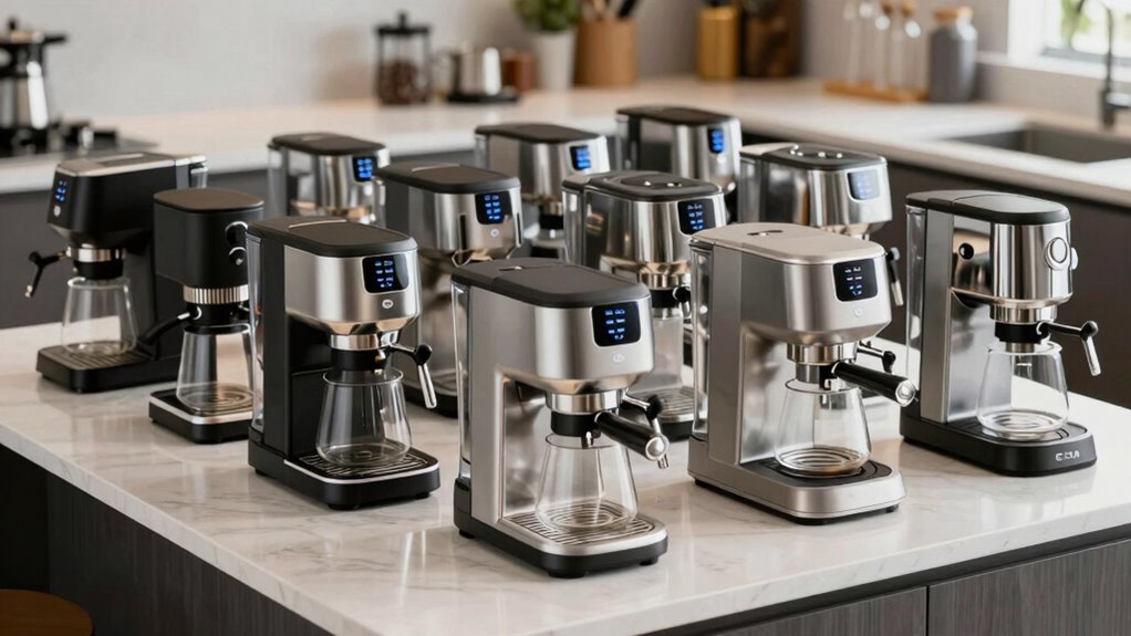 Maintaining precise temperature control is essential for extracting the full flavor potential of your coffee, which is why I prioritize this feature when selecting a drip coffee maker under $800. Ideal brewing temperatures, typically between 194°F and 205°F, ensure proper extraction and a balanced flavor profile. Consistent temperature regulation prevents under- or over-extraction, leading to a richer, more aromatic cup. Many advanced models offer digital or analog controls, allowing me to set and maintain specific temperatures easily. This precision mimics professional barista standards and helps replicate the nuanced flavors of specialty brews. Variations during brewing can considerably impact aroma, body, and taste, so reliable temperature control is a critical factor in choosing a high-quality coffee maker at this price point.