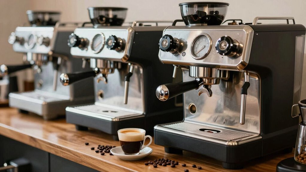 While exploring semi-automatic espresso machines under $2000, I quickly realize that temperature control systems play an essential role in brewing exceptional coffee. Many of these machines utilize PID technology, which helps maintain stable water temperatures for enhanced flavor extraction. With effective temperature control, I can adjust brewing temperatures between 90°C and 96°C, tailoring the process to different coffee beans and personal preferences. Some models even feature active temperature control mechanisms that guarantee consistent heat stability throughout brewing, preventing any fluctuations. Additionally, low-pressure pre-infusion systems allow for even saturation of coffee grounds, maximizing flavor. Advanced machines might offer multiple temperature settings, giving me the flexibility to customize my brewing experience according to my taste and the characteristics of the beans I’m using.