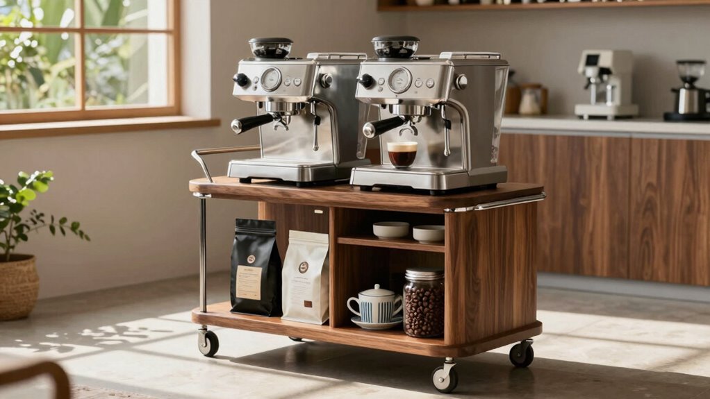 When I’m choosing a coffee station cart for my espresso machine, I focus on a few key factors. Size and dimensions matter to guarantee it fits my space, while storage capacity options help me keep everything organized. I also consider mobility, stability, material durability, and design aesthetics to create a functional and stylish setup.