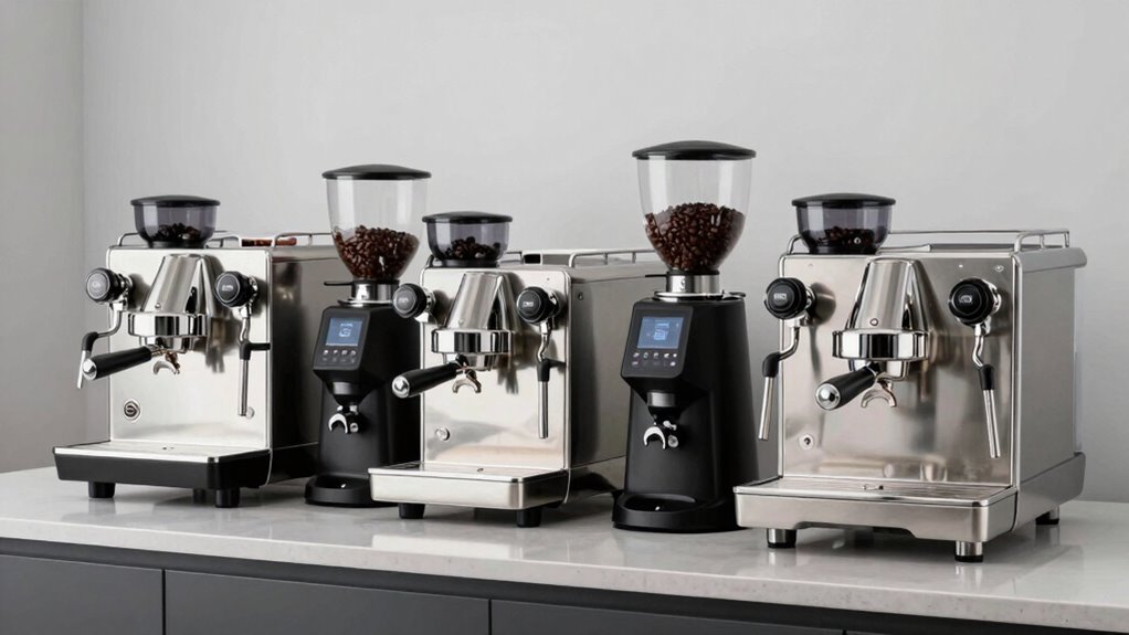 Have you ever wondered how precise grind adjustments can make or break your espresso? The range of settings, typically from 10 to 40 levels, gives you fine control over the coffee’s particle size. Adjustable grind settings let you tailor the fineness for different brewing methods, whether it’s a fine espresso or coarser French press. Some machines feature stepless adjustment mechanisms, offering continuous control for more exact tuning. Consistent grind adjustment is crucial for ideal extraction, flavor, and crema. Many machines include clear labels or digital interfaces that make selecting and remembering your preferred grind size straightforward. This precision ensures you can consistently achieve the perfect shot, making your espresso experience both easier and more satisfying.